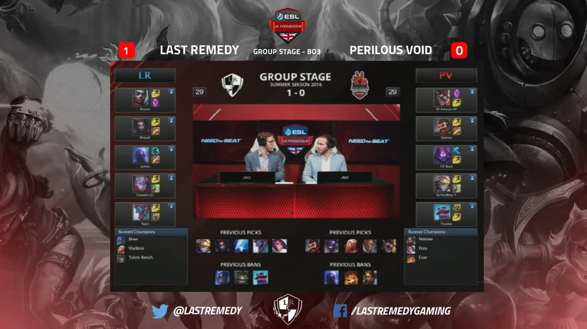 A convincing first game from Last Remedy was to be expected, the new org made some changes to their line-up before the Premiership. And it seems to have paid off: Last Remedy ended the game with a 17k gold lead over Perilous Void.