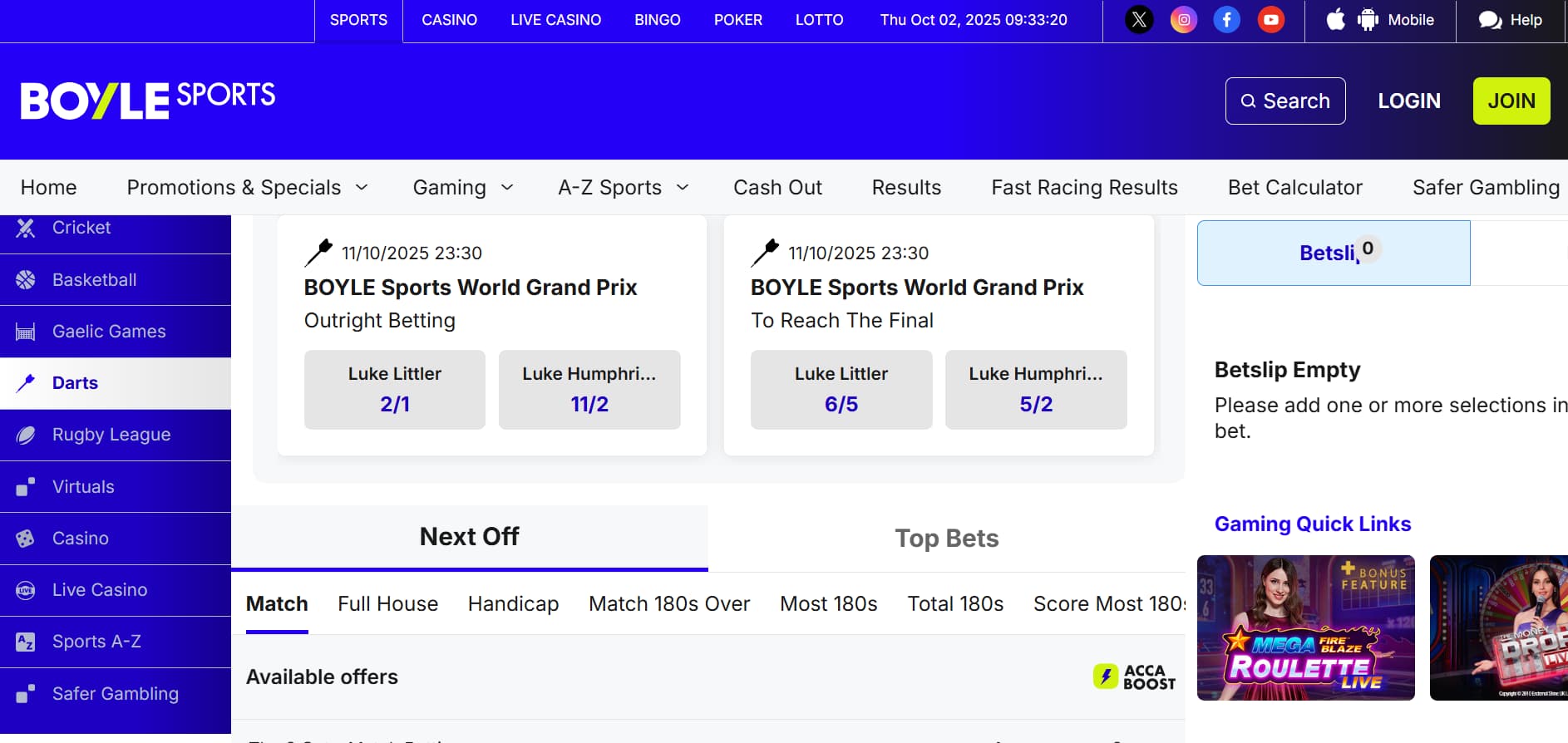 Few bookies combine this level of coverage with so many special bets, including Total 180s to Highest Checkout. In addition, you can use certain BoyleSports promo codes to unlock free bets or other generous offers suitable for eligible darts markets.