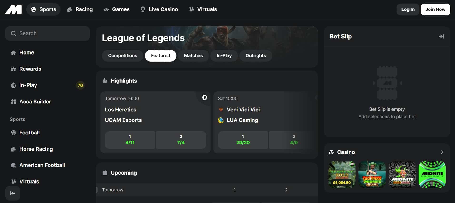 Midnite provides great choices for esports betting, including many League of Legends tournaments and league matches. What sets Midnite apart from other sportsbooks is its in-play betting options. You can watch the World Championship and Mid-Season Invitational live while benefiting from appealing live odds. The LoL markets are broad, offering options like first game kills, first blood, most kills, and odd or even kills.