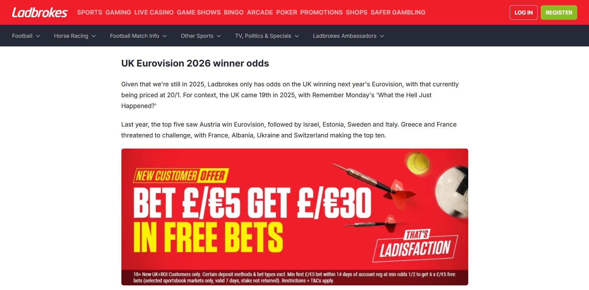 Which Eurovision betting sites have the best bonuses?Paddy Power often tops our list with generous free‑bet welcome offers and Eurovision‑specific promos. William Hill also stands out by rolling out event‑targeted incentives tied to the song contest. Betfred, meanwhile, adds value with its dedicated content guide and bonus tokens during the semi‑finals.What time is Eurovision on in the UK?The song contest typically begins at 8.00 pm GMT, but this may vary depending on its location.How accurate are Eurovision odds?The odds you’ll find when betting on the Eurovision are often a strong indicator of likely finalists and favourites. However, they’re not foolproof, as televote surges, staging surprises, or jury preferences can upset projections.What number is the UK in Eurovision wins in total?The UK has won Eurovision five times, making it one of the contest’s top-performing nations historically. Even though its last victory was in 1997, the UK’s Eurovision betting odds often reflect strong legacy support.Is betting on Eurovision difficult?Betting on the song contest isn’t necessarily difficult, but it does require research to get things right. Eurovision bookies offer many markets, and outcomes can be unpredictable due to staging, jury preferences, and public voting patterns.What are the odds of the UK winning Eurovision?The UK’s Eurovision betting odds are currently set at 20/1, suggesting an implied winning chance of around 4.8 %. However, these odds can change drastically as songs are selected and rehearsals get underway.Resources